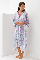 Женственная модель – халат универсальной длины до щиколотки, на запахе из легкой, натуральной вискозы белого цвета с цветочным рисунком. Комфортная длина модели и свободный силуэт созданы для отдыха и красоты. Простой, но при этом элегантный дизайн халата подчеркнут акцентами из однотонной ткани лилового цвета, которой украшены широкие манжеты свободных рукавов длиной 3/4. Длинный съемный пояс на шлевках отлично подчеркнет ваш силуэт. Легкость и нежность ткани и цвета создают удивительную атмосферу и романтическое настроение. Характеристики: Длина рукава от плечевого шва или плеча (см): 55 Длина по спинке (см): 110 Степень плотности ткани: Ткань легкая Растяжимость ткани: Хорошо тянется Пояс: В комплекте Вырез горловины: V-образный Тип рукавов: В три четверти Состав: микромодал (вискоза) 100%