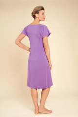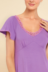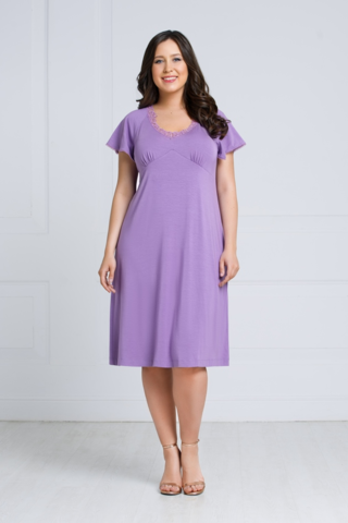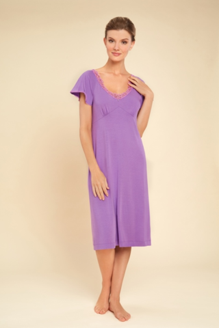 Женственная сорочка средней длины ниже колена выполнена из приятной вискозы нежного цвета лаванды. Акцент модели – глубокий V-образный вырез, эффектно оформленный полупрозрачным ажурным кружевом в тон основной ткани с красивой подвеской. Отрезной лиф декорирован драпировкой в районе груди. Воздушные рукава-реглан украшены тонкой ажурной тесьмой. Модель слегка расклешенного силуэта выполнена из хорошо тянущейся ткани, мягко облегающей фигуру и красиво струящейся вниз. Нежный цвет и сочетание мягкой вискозы и кружева создают романтичное настроение. Состав: вискоза 100%