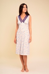 Женственная сорочка средней длины ниже колена выполнена из натуральной вискозы светло-бежевого цвета с набивным цветочным узором. Акцент модели – V-образный вырез, эффектно оформленный полупрозрачным ажурным кружевом яркого фиолетового цвета с красивым рисунком. Отрезной лиф декорирован драпировкой в районе груди и бантиком в центре декольте. Спинка модели закрытая. Модель слегка расклешенного силуэта выполнена из хорошо тянущейся ткани, мягко облегающей фигуру и красиво струящейся вниз. Нежный цветочный узор и сочетание цветов создают романтичное настроение. Состав: вискоза 100%