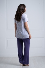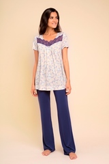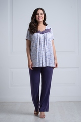 Нежная, легкая пижама с брючками выполнена из 100% натуральной вискозы. Топ свободного силуэта с короткими рукавами выполнен из вискозы бежевого цвета с нежным цветочным принтом. Область декольте украшена эффектной вставкой из полупрозрачного кружева фиолетового цвета с цветочным узором. От декольте вниз протянулись вытачки-складки, которые красиво моделируют силуэт в области груди и дарят модели еще больше комфорта и свободы. В комплекте свободные брючки прямого кроя с резинкой в поясе. Удобная и красивая модель высокого качества для комфортного отдыха. Состав: 100% микромодал