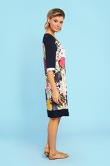 Женственное летнее платье длиной до колена выполнено из легкой, струящейся вискозы с оригинальным, крупным цветочным принтом и отделкой из однотонной вискозы синего цвета. Модель с рукавами средней длины с небольшими манжетами из принтованной ткани. V-образный вырез горловины подчеркивает красоту шеи. На спинке платья красиво заложены встречные складочки, которые моделируют силуэт. В боковых швах карманы. Прямой крой и натуральная ткань не стесняют движений и позволят Вам чувствовать себя комфортно в любое время. Эффектный принт на ткани привлекает внимание и создает оригинальный look.