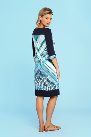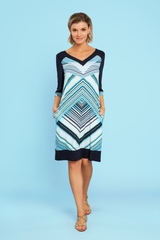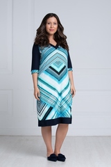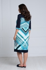 Женственное летнее платье длиной до колена выполнено из легкой, струящейся вискозы с оригинальным, крупным геометрическим принтом в голубых тонах и отделкой из однотонной вискозы синего цвета. Модель с рукавами средней длины с небольшими манжетами из принтованной ткани. V-образный вырез горловины подчеркивает красоту шеи. На спинке платья красиво заложены встречные складочки, которые моделируют силуэт. В боковых швах карманы. Прямой крой и натуральная ткань не стесняют движений и позволят Вам чувствовать себя комфортно в любое время.