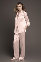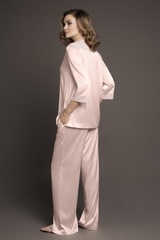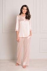 Женственная пижама из легкой, атласной ткани персикового цвета. Верх – рубашка с вырезом горловины с отложным воротником и застежкой на пуговицы. Манжеты рукавов длиной 3/4 и кокетка спинки выполнены из легкого полиэстера в тон основной ткани. Плечи украшены вставками из микросетки с оригинальной «арочной» вышивкой. На спинке от кокетки заложена встречная складка, моделирующая силуэт. Подол скруглен, по бокам два удобных разреза. Низ – прямые, широкие брюки на плоской резинке по талии с застроченными «стрелками». В боковых швах брюк комфортные карманы. Характеристики: Длина рукава от плечевого шва или плеча (см) 45 Длина по спинке (см) 69 Длина по внутреннему шву-брюки (шорты) (см) 80 Степень плотности ткани: Ткань легкая Растяжимость ткани: Тянется слабо Комплектация Рубашка+брюки Тип рукавов В три четверти Состав: 93% полиэстер, 7% спандекс