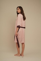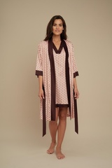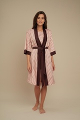 Легкий халат универсальной длины до колена, на запахе выполнен из атласной ткани стрейч с геометрическим принтом «ромбы». Комфортная длина модели и свободный силуэт созданы для отдыха и красоты. Простой, но при этом элегантный дизайн халата подчеркнут акцентами из однотонной ткани бордового цвета, которой украшены широкие манжеты свободных рукавов длиной 3/4. Длинный, однотонный съемный пояс на шлевках отлично подчеркнет ваш силуэт. Халат составит отличный комплект с сорочкой или пижамой из новой коллекции. Состав: полиэстер 93% , спандекс 7%