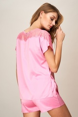 Прелестная пижама с шортиками выполнена из легкой, атласной ткани в эффектном розовом цвете. Топ свободного кроя с цельнокроенными короткими рукавами и боковыми разрезами украшен в верхней части спинки и плеч роскошной полупрозрачной вставкой из кружева с изысканным орнаментом. V-образный вырез горловины подчеркивает красивую шею. Короткие шортики по бокам также украшены кружевными вставками, которые соблазнительно просвечиваются. Пояс шортиков на тонкой, комфортной резинке. Сочетание атласной ткани и кружева смотрится особенно нежно. Характеристики: Длина рукава от плечевого шва или плеча (см) 24 Длина по спинке (см) 62 Тип карманов Карманов нет Длина по внутреннему шву-брюки (шорты) (см) 5 Степень плотности ткани Ткань легкая Растяжимость ткани Хорошо тянется Особенность ткани Кружево просвечивается Комплектация Блуза + шорты Длина по боковому шву (см) 28 Состав: 93% полиэстер, 7% спандекс