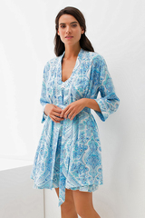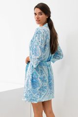 Красивый халатик на запахе из легкой вискозной ткани высокого качества. Приятный голубой цвет и классический принт «восточные огурцы» привлекает взгляд. Халат длиной выше колен, свободного кроя для комфортной носки. Манжеты длинных рукавов, а также края полочек декорированы белой ажурной тесьмой, красиво оттеняющей основной цвет модели. В боковых швах халата удобные кармашки. В комплекте съемный длинный пояс на шлевках, Составьте идеальный домашний комплект с сорочкой или пижамой из нашей коллекции. Характеристики: Длина рукава от плечевого шва или плеча (см): 42 Длина по спинке (см): 96 Степень плотности ткани: Ткань легкая Растяжимость ткани: Не тянется Состав: 100% вискоза