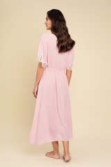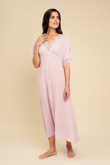 Женственная, длинная сорочка выполнена из легкого батиста розового цвета. Акцент модели – глубокий V-образный вырез, эффектно оформленный полупрозрачным ажурным кружевом с красивой подвеской с бахромой. Отрезной, фигурный лиф декорирован драпировкой в районе груди. Воздушные рукава-реглан так же украшены ажурным кружевом. На спинке в области талии вшита тонкая резиночка для красивого силуэта. Модель расклешенного кроя мягко облегает фигуру и красиво струится вниз. Нежный цвет и сочетание ткани и кружева создают особенное настроение. Состав: 100% вискоза.