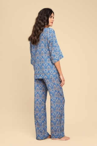 Красивая и комфортная пижама выполнена из легкой, мягко струящейся вискозы высокого качества с восточным орнаментом. Цельнокроенные рукава средней длины мягко ниспадают и создают особый комфорт. V-образный вырез декольте топа, украшенный однотонной атласной тесьмой золотистого цвета и аппликацией в виде птички, привлекает взгляд и делает образ особенно романтичным. Рукава и низ топа также декорированы тонкой атласной тесьмой. Низ пижамы – классические прямые брючки. Боковые карманы отделаны тонким кантом. Пояс на плоской резинке. Свободный крой пижамы не облегает, скрывая легкие недостатки фигуры и даря комфорт во время сна и отдыха.