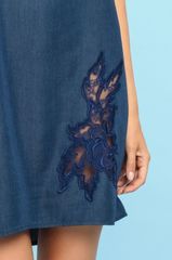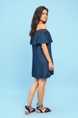 Прекрасное, романтичное платье модного в этом сезоне дизайна выполнено из тонкой, легкой вискозы высокого качества синего цвета под джинсовую ткань. Платье украшено по верху широкой оборкой, которая эффектно ниспадает и демонстрирует красивую линию плеч и шеи. Мягкая резиночка по краю комфортно удерживает верх платья. Модель свободного, расклешенного кроя с аппликацией в виде цветка сбоку покорит Вас своей женственностью. Короткая длина выше колен подчеркнет красоту фигуры. Легкая ткань мягко струится вдоль тела, создавая нежный, романтичный образ. Состав: 100 % вискоза
