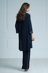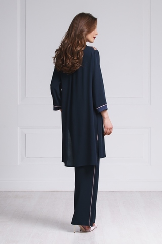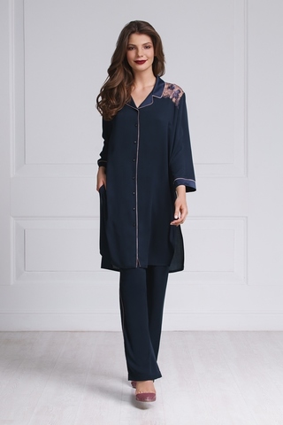 Стильный домашний комплект выполнен из тонкой, мягко струящейся вискозы глубокого синего цвета в сочетании с атласной тканью. Жакет удлиненного кроя, свободного силуэта, с боковыми разрезами. V-образный вырез дополнен небольшим воротником рубашечного фасона из атласной ткани с тонким, золотистым кантом. Рукава декорированы манжетами в том же стиле. Вставки на плечах выполнены из микросетки с красивой цветочной вышивкой. Жакет застёгивается спереди на небольшие пуговки. Длинные брючки свободного кроя на удобной резинке по талии украшены тонким кантом вдоль бокового шва. Характеристики: Длина рукава от плечевого шва или плеча (см) 48 Длина по спинке (см) 96 Вид застежки Пуговицы Тип воротника Отложной Тип карманов Прорезные Длина по внутреннему шву-брюки (шорты) (см) 78 Степень плотности ткани Ткань легкая Растяжимость ткани Не тянется Особенность ткани Кружево просвечивается Комплектация Рубашка+брюки Вырез горловины V-образный Тип рукавов 7/8 Состав: 100 % вискоза.