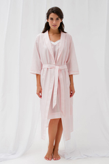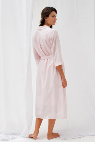 Женственный халат универсальной длины ниже колена на запахе из легкой, 100% натуральной смесовой ткани с добавлением шёлка пастельного светло-розового цвета. Комфортная длина модели и свободный силуэт созданы для отдыха и красоты. Простой, но при этом элегантный дизайн халата подчеркнут акцентами из тончайшего кружевного канта белого цвета с цветочным узором, которым украшены манжеты свободных рукавов длиной ¾, а также лацканы отложного воротника. Длинный съемный пояс на шлевках отлично подчеркнет ваш силуэт. Легкость и нежность ткани и цвета создают удивительную атмосферу и романтическое настроение. Характеристики: Длина рукава от плечевого шва или плеча (см): 45 Длина по спинке (см): 142 Вид застежки: Завязка Тип воротника: Отложной Степень плотности ткани: Ткань легкая Растяжимость ткани: Не тянется Особенность ткани: Ткань просвечивается Пояс: В комплекте Вырез горловины: V-образный Тип рукавов: Широкие в три четверти Состав: хлопок 70%, шёлк 30%