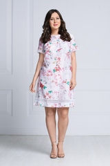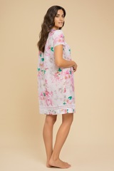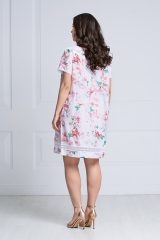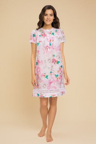 Прекрасная сорочка из натуральной смесовой ткани с добавлением прохладного шелка белого цвета с нежным принтом. Верх сорочки с округлым вырезом горловины декорирован белой кружевной тесьмой и оформлен с кокеткой. Модель с свободными рукавами длиной до локтя. В нижней части сорочка также украшена кружевной тесьмой. Спереди до талии сорочка застегивается на пуговицы. Модель прямого силуэта отлично скроет недостатки фигуры и подчеркнет достоинства. Нежная ткань и стильный дизайн соединяются в этой привлекательной модели. Состав: хлопок 70%, шёлк 30%