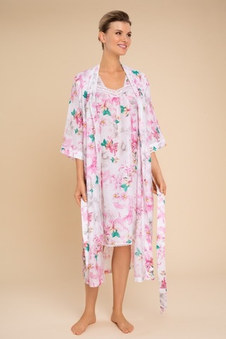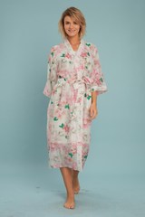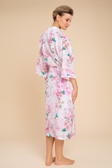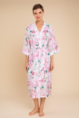 Женственный халат универсальной длины ниже колена на запахе из легкой, 100% натуральной смесовой ткани с добавлением шёлка с нежным цветочным притом. Комфортная длина модели и свободный силуэт созданы для отдыха и красоты. Простой, но при этом элегантный дизайн халата подчеркнут акцентами из тончайшего кружевного канта белого цвета, которым украшены манжеты свободных рукавов длиной ¾, а также края полочек. Длинный съемный пояс на шлевках отлично подчеркнет ваш силуэт. Легкость и нежность ткани и цвета создают удивительную атмосферу и романтическое настроение. Состав: хлопок 70%, шёлк 30%