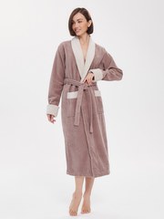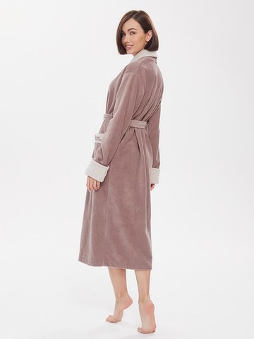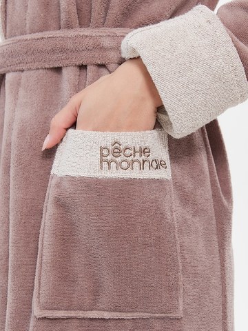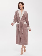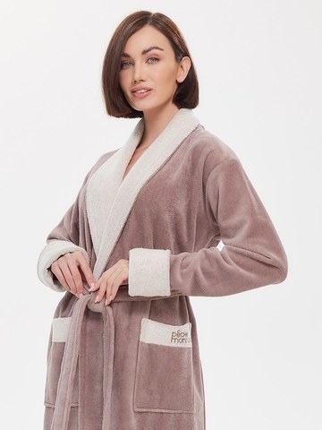 Внешняя сторона под велюр, внутренняя - петельчатая махра, создающая приятный и легкий массажный эффект. Модель удлиненная. Классический фасон с поясом на талии и накладными карманами. Лаконичный дизайн, нежные пастельные тона, комбинированная отделка воротника, манжет и карманов. Брендированная вышивка Peche Monnaie на кармане.