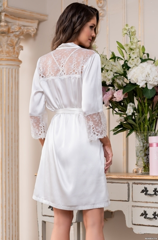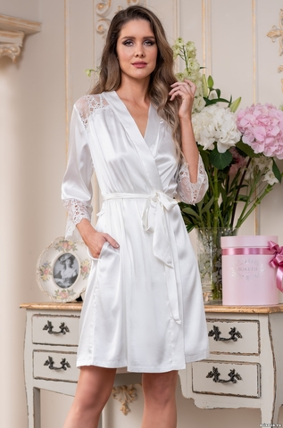 Элегантный запашной белый шелковый халат с рукавами длиной ¾, выполнен из смесового однотонного шелка. Вставки из французского кружева украшают кокетки полочек и спинки, а также низ рукавов. По бокам обработаны карманы.
