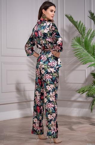 Брючный комплект Mia-Amore выполнен из искусственного шелка c экзотическим принтом и состоит из жакета и брюк. Жакет на пуговицах,с двумя накладными карманами, на рукавах ¾ широкие притачные манжеты. Брюки длинные, с карманами в боковых швах и притачными широкими манжетами. Жакет и брюки декорированы контрастно-красным кантом. Комплект дополнен поясом. Состав: полиэстер 100%