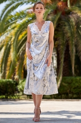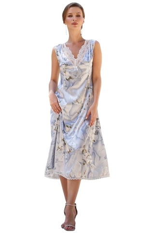 Длинная сорочка Mia-Amore с V-образным вырезом, выполнена из принтованного смесового шелка. Вырез и низ сорочки декорированы ажурным кружевом. Лиф украшен бантиком с подвеской.