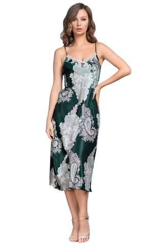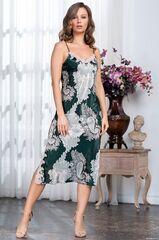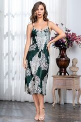 Длинная сорочка на тонких бретелях Mia-Amore выполнен из принтованного шелкового смесового полотна насыщенного изумрудного оттенка. Лиф сорочки и разрез декорированы ажурным кружевом молочного цвета. По центру лифа бантик с подвеской.
