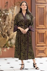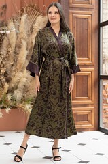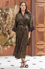 Длинный халат-кимоно Mia-Amore с широким рукавом длиной 3/4. Халат выполнен из принтованного смесового шелка с однотонной отделкой. По бокам обработаны карманы.