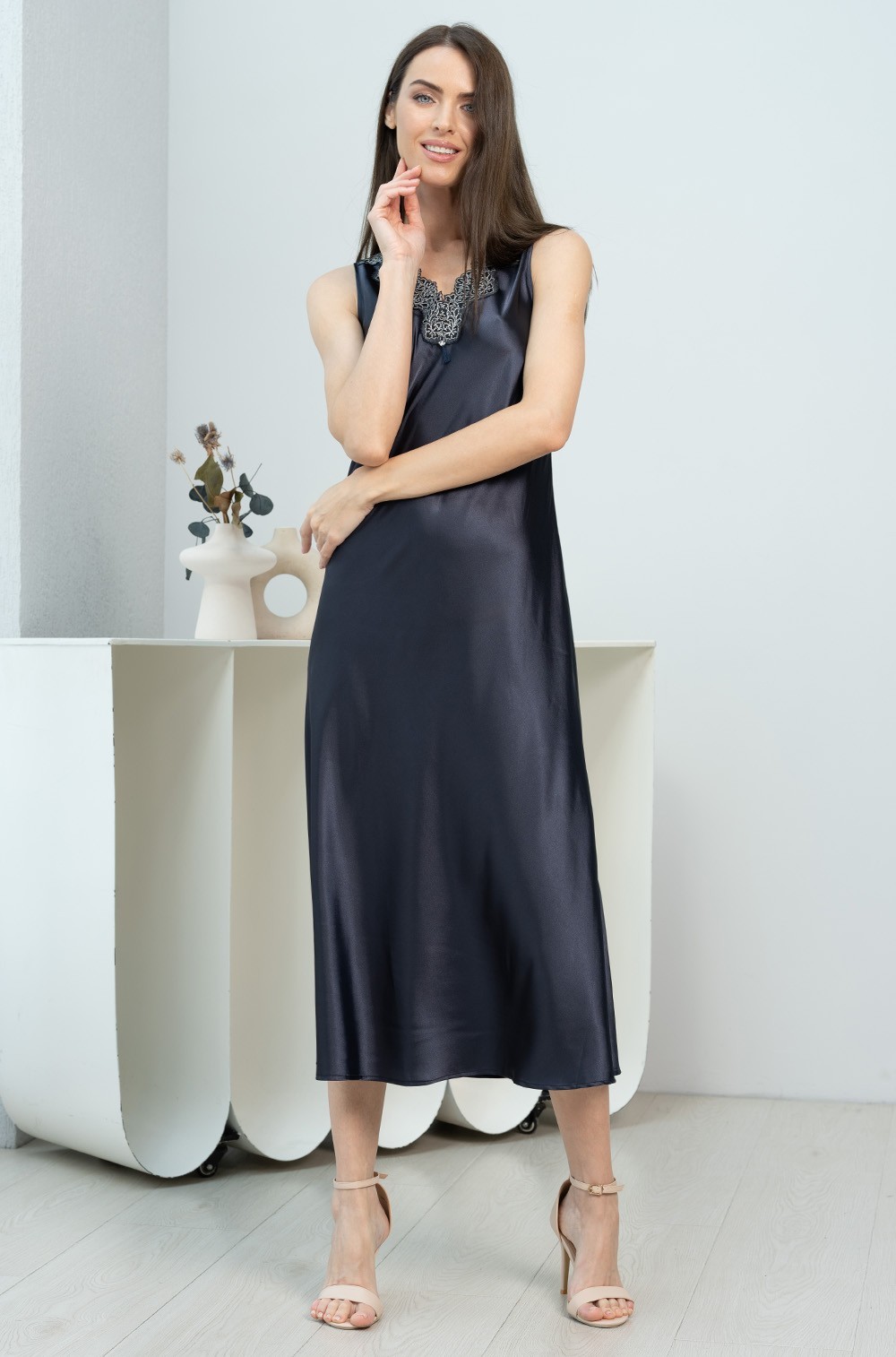 Женственная длинная сорочка Mia-Amore на широких бретелях. Изделие выполнено из однотонного смесового шелка. Вышивное двухцветное кружево украшает вырез сорочки. Декор - атласный бантик с подвеской, расположенный по вырезу сорочки. По бокам расположены разрезы для свободы движения.