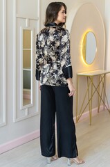 Комплект-тройка Mia-Amore выполнен из смесового шёлка, состоит из принтованного топа на тонких бретелях, принтованного запашного жакета и однотонных чёрных брюк. Лиф топа, рукава жакета и планка отделаны чёрным атласом в тон брюк. Жакет запахивается на пояс с золотыми декоративными кисточками.