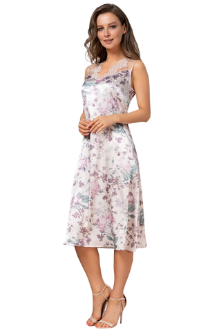 Длинная сорочка Mia-Amore на широких бретелях, выполнена из принтованного смесового шелка. Верх сорочки украшен ажурным кружевом. Декор - атласный бантик с подвеской по центру выреза.