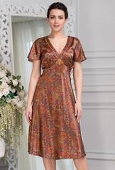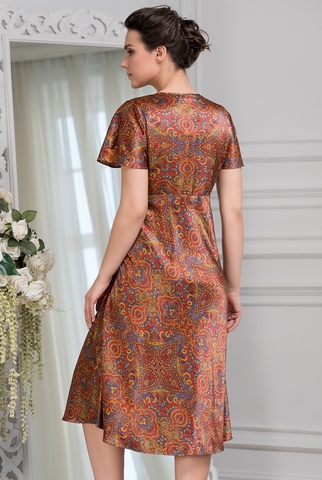 Длинная сорочка Mia-Amore с короткими рукавами выполнена из принтованного смесового шелкового полотна. Горловина сорочки декорирована контрастным кантом. По центру лифа расположен ажурный декоративный элемент.