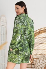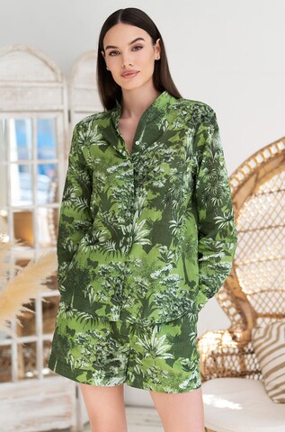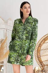 Комплект состоит из рубашки с воротником-стойкой и шорт. Шорты с широким эластичным поясом. По бокам шорт расположены карманы.