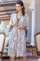Классический длинный халат-кимоно Mia-Amore из смесового принтованного шелка с жаккардовой основой. Ажурное кружево расположено по низу рукавов. Линию борта подчеркивает узкий кант в цвет принта шелка. Состав: 70% натуральный шелк, 30% полиэстер