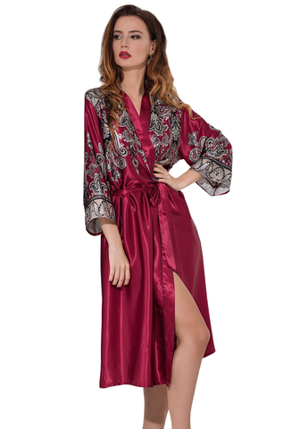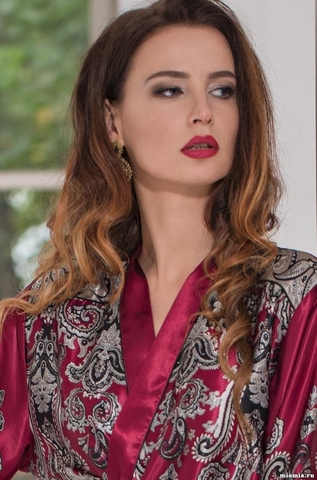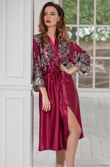 Длинный классический халат – кимоно Mia-Amore выполнен из смесового шелка с купонным принтом расположенным по верхней части полочки, спинки и рукавам. Орнамент украшает низ рукавов. По бокам расположены карманы. Состав: 70% натуральный шелк, 25% полиэстер, 5% эластан