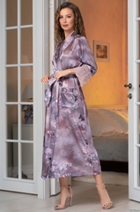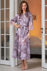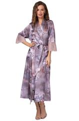 Длинный халат Mia-Amore с рукавами длиной 3/4 выполнен из смесового принтованного шелка. Низ рукавов украшен ажурным кружевом. Ширина халата регулируется по талии поясом, спереди накладные карманы с декоративным кантом. Состав 70% натуральный шелк, 25% полиэстер, 5% эластан