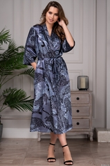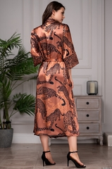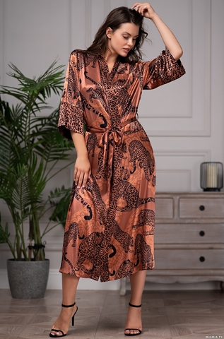Длинный халат Mia-Amore с рукавом ¾, выполнен из принтованного смесового шелка с отделкой тканью анималистичным компаньоном и контрастным кантом по краю борта и низу рукавов. По бокам обработаны карманы. Состав 70% натуральный шелк, 25% полиэстер, 5% эластан