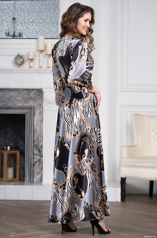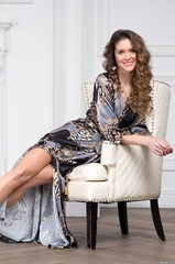 Длинный халат Mia-Amore приталенного силуэта с застежкой на пуговицы и рукавом длиной ¾, выполнен из принтованного атласа с отделкой в виде золотых кантов. В боковых швах расположены карманы. Концы пояса украшают золотые кисточки. Состав: полиэстер 100%