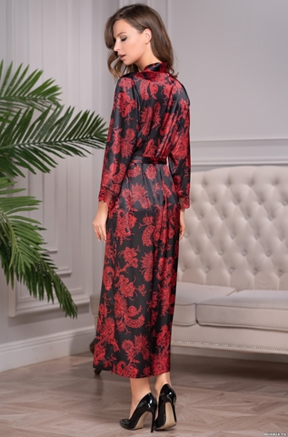 Длинный элегантный халат Mia-Amore с запахом на поясе выполнен из принтованного искусственного шелка. Рукава халата по низу декорированы кружевом. В боковых швах халата удобные карманы.