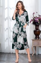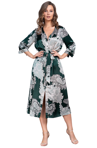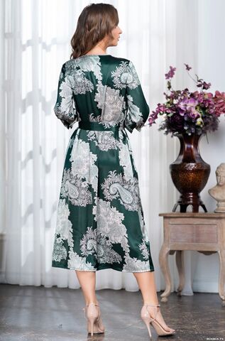 Длинный халат с центральной застежкой на пуговицы Mia-Amore выполнен из принтованного шелкового смесового полотна насыщенного изумрудного оттенка. Детали рубашки отделаны золотистым кантом.