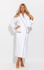 Изысканный женский халат класса Люкс из нежной махровой ткани с добавлением бамбука. Халат с воротником - шалькой, с длинными, слегка расклешенными к низу рукавами. Декоративный кант украшает воротник и полы халата, а также манжеты рукава и верхняя часть кармана. Красивая и нежная вышивка в виде цветов шоколадного и золотисто-бежевого цвета - на воротнике, манжете рукава и карманах. Женственный и нежный, он подарит комфорт, свободу и ощущение лоска и роскоши своей хозяйке!