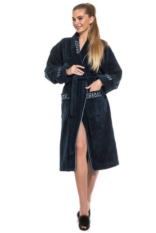 Изысканный женский халат класса Люкс из нежной махровой ткани с добавлением бамбука. Халат с воротником - шалькой, с длинными, слегка расклешенными к низу рукавами. Декоративный кант украшает воротник и полы халата, а также манжеты рукава и верхняя часть кармана.