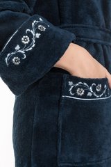 Глубокий синий "сапфировый" цвет халата с изумрудным оттенком - благородний и изысканный. Красивая вышивка в виде цветов шоколадного и золотисто-бежевого цвета на воротнике, манжете рукава и карманах.