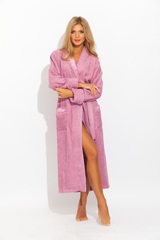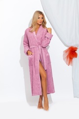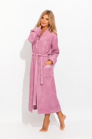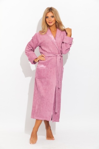 Изысканный женский халат с вышивкой. Халат класса Люкс из нежной махровой ткани с добавлением бамбука. Халат с воротником - шалькой, с длинными, слегка расклешенными к низу рукавами и манжетам для удобства. Декоративный кант украшает воротник и полы халата, а также манжеты рукава и верхняя часть кармана. Красивая и нежная вышивка в виде цветов Лилии - на воротнике и карманах.