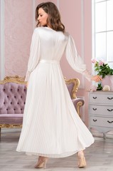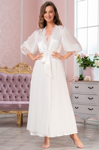Длинный пеньюар Mia-Amore из атласного полотна выполнен в сочетании с тонким кружевом и шифоном-плиссе. Халат может стать как дополнительный предметом к вечернему образу, так и самостоятельной единицей. Идеально будет сочетаться с короткими и длинными сорочками. Легкость пеньюару придают шифоновые рукава и струящийся плиссированный низ.