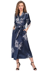 Длинный шелковый халат с рукавами длиной 3/4 выполнен из принтованного смесового полотна. Низ рукавов декорирован изысканным широким вырезным кружевом. Халат запахивается на пояс, в боковых швах карманы.