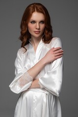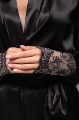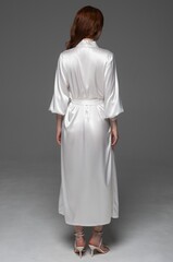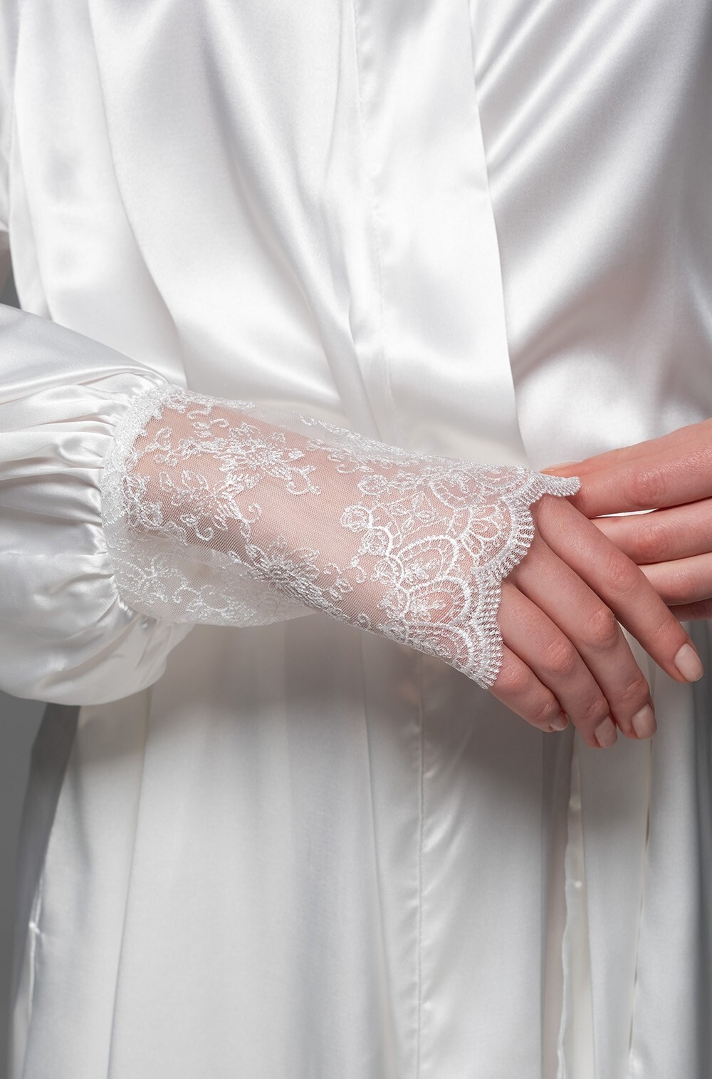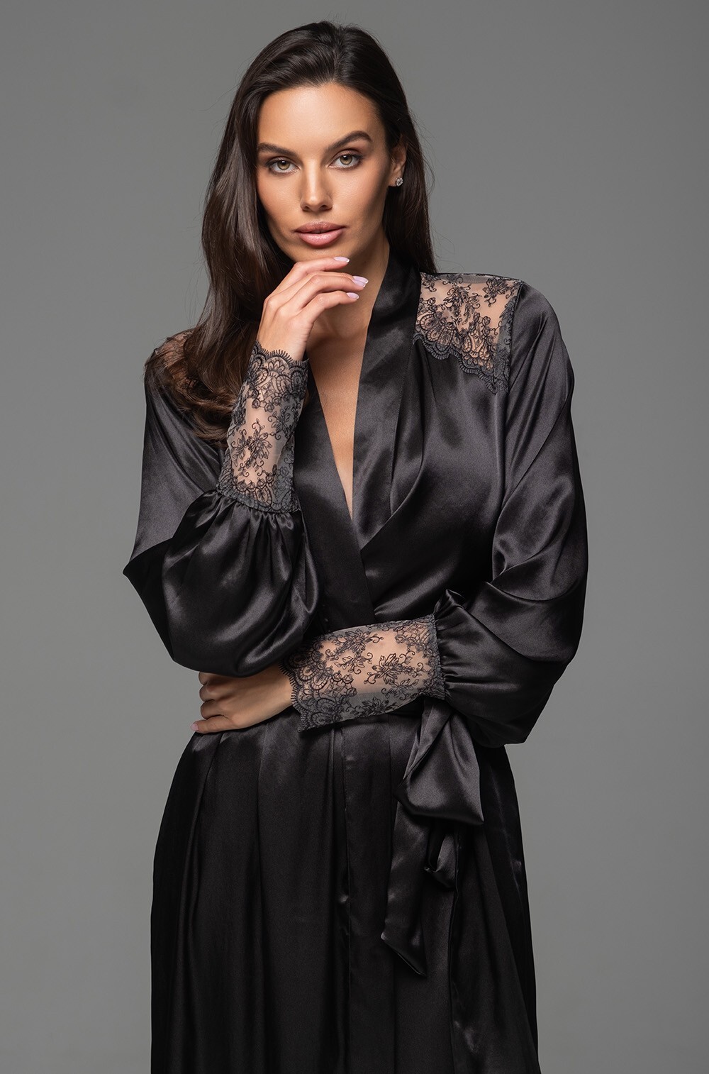 Длинный запашной халат Mia-Amore выполнен из однотонного смесового шёлка. Пышные рукава халата по низу собраны на кружевную манжету. Спереди верх халата украшен вставками из кружева. В боковых швах есть карманы. Халат запахивается с помощью широкого съемного пояса.