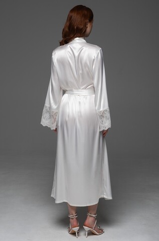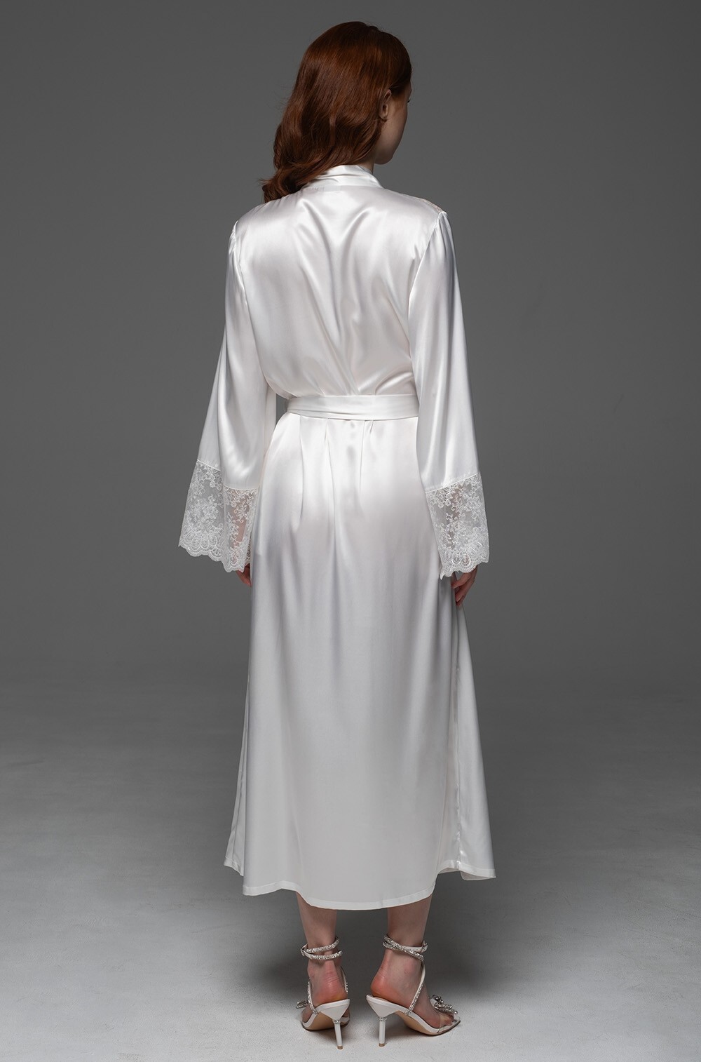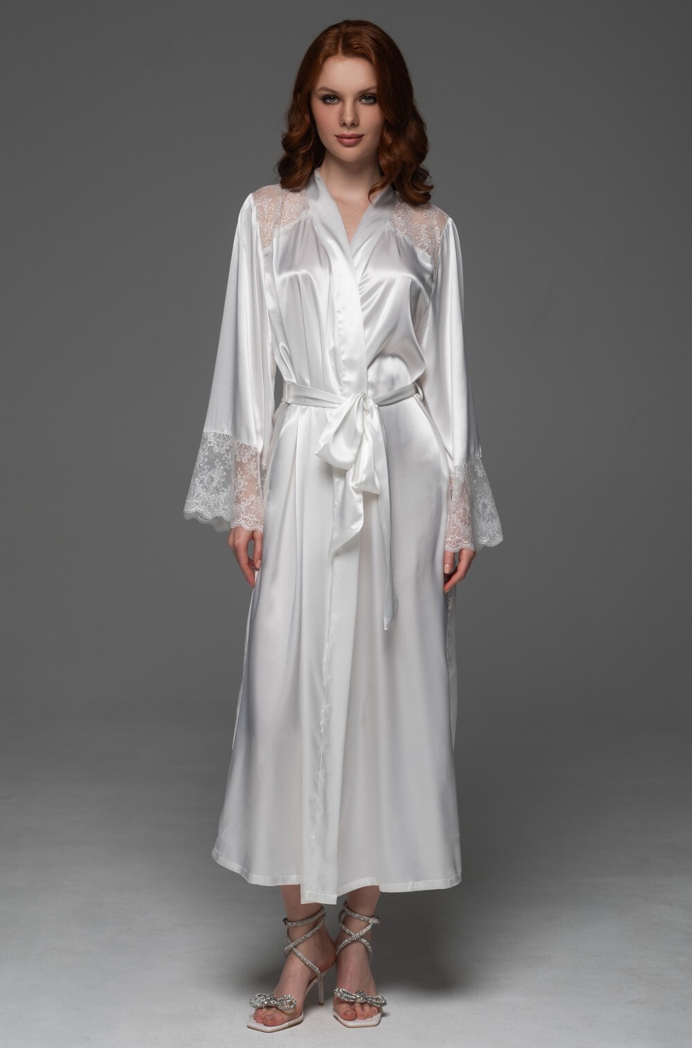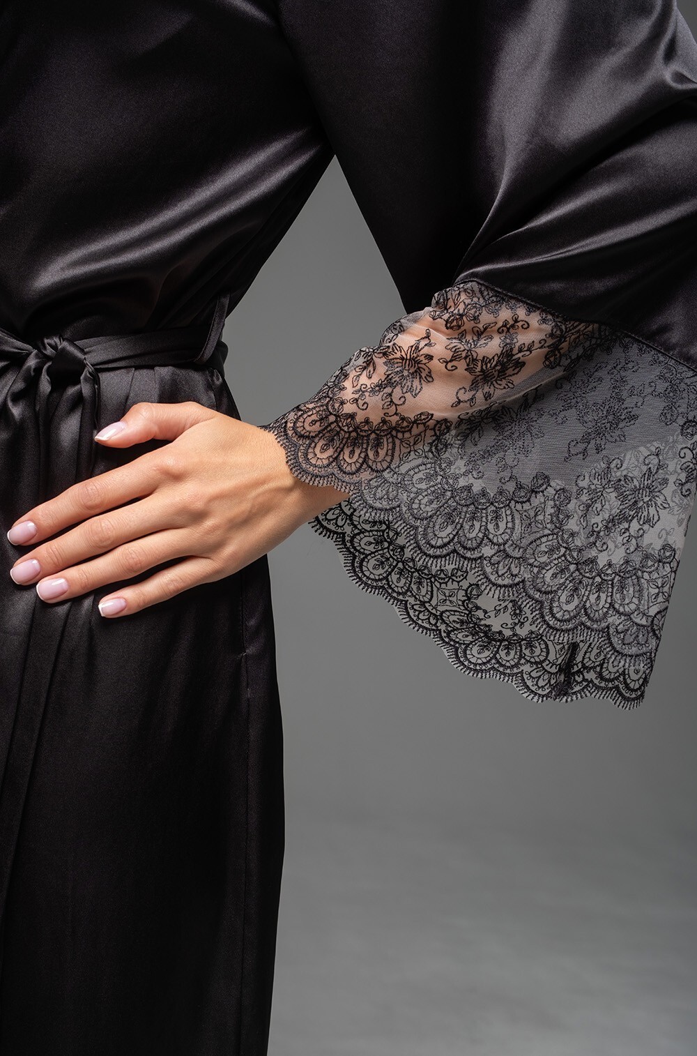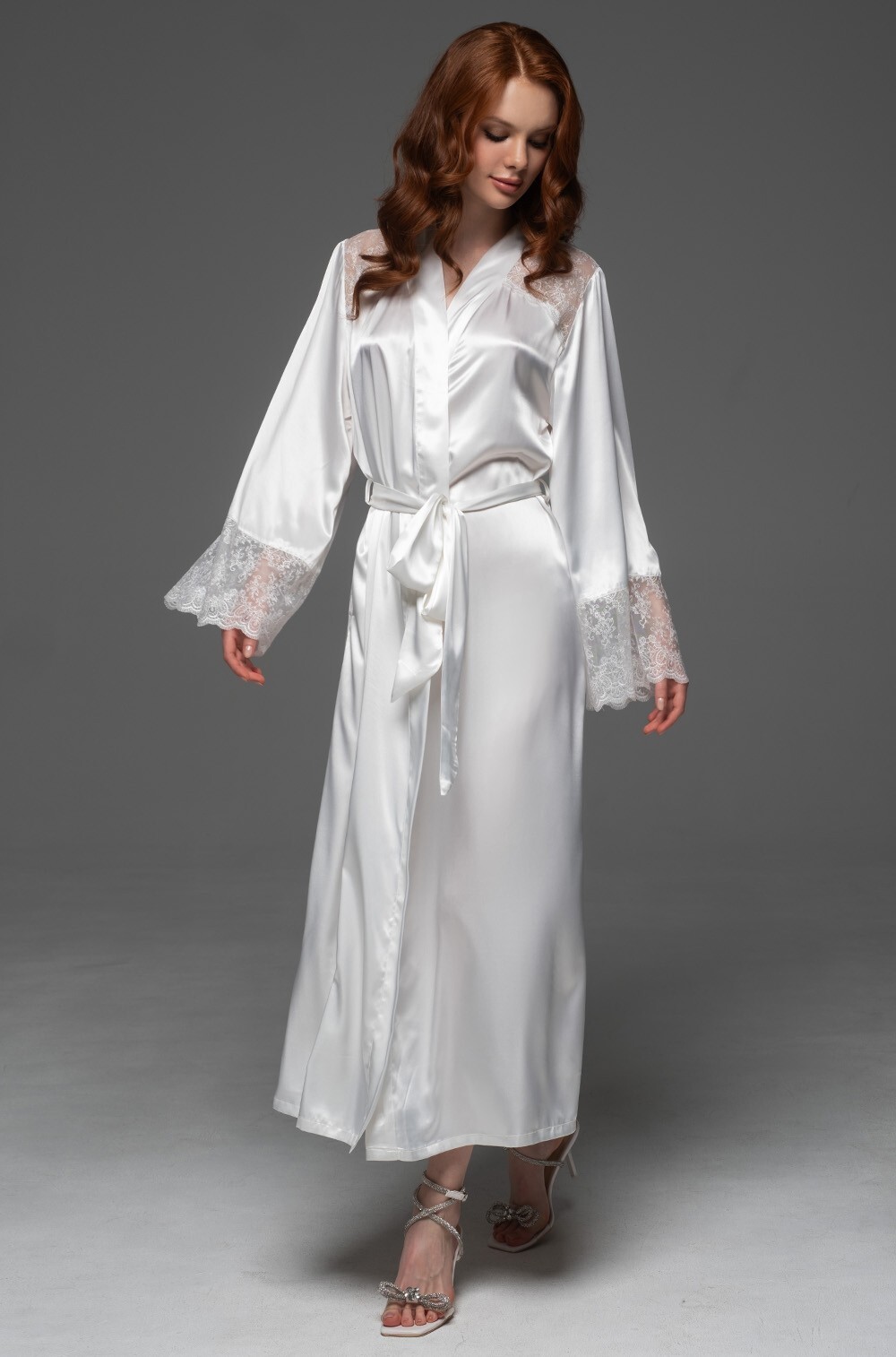 Длинный запашной халат Mia-Amore выполнен из однотонного смесового шёлка. Широкие рукава халата по низу украшены широким кружевом. Спереди верх халата украшен вставками из кружева. В боковых швах есть карманы. Халат запахивается с помощью широкого съемного пояса.