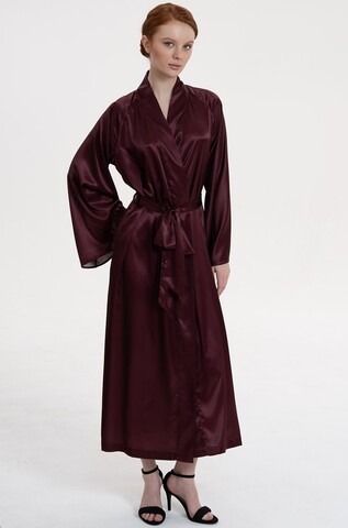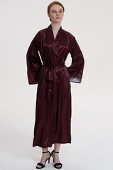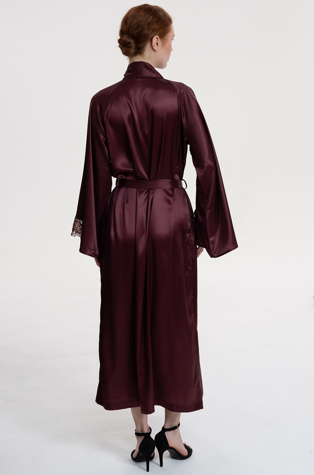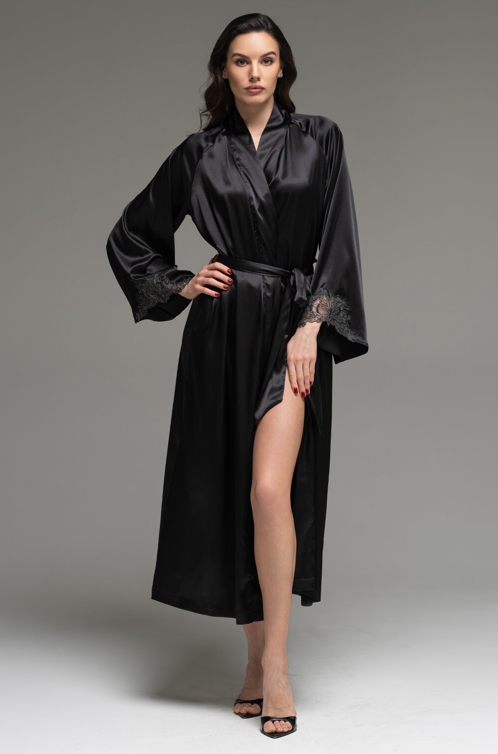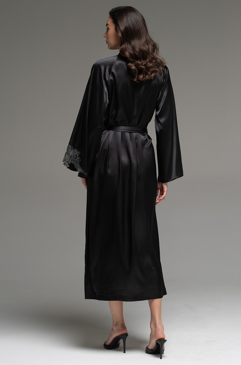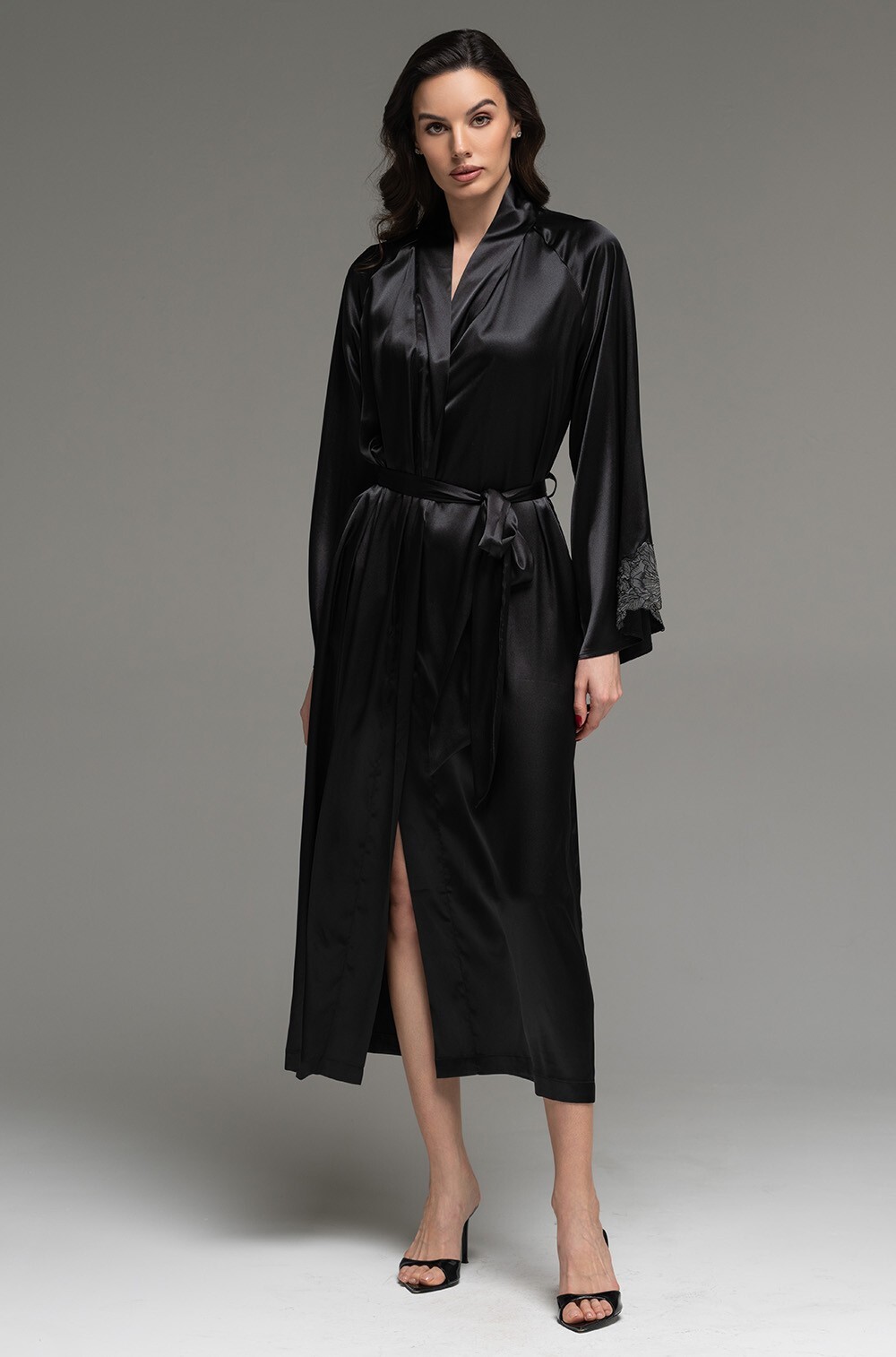 Длинный запашной халат Mia-Amore с длинными рукавами реглан выполнен из однотонного смесового шёлка. По низу рукава украшены ажурными вставками из вышитого кружева. В боковых швах есть карманы. Халат запахивается с помощью широкого съёмного пояса.