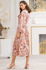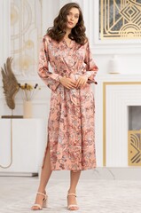 Длинный запашной халат Mia-Amore выполнен из принтованного смесового шелка. Рукава с широкими сободными манжетами. В боковых швах кармашки.