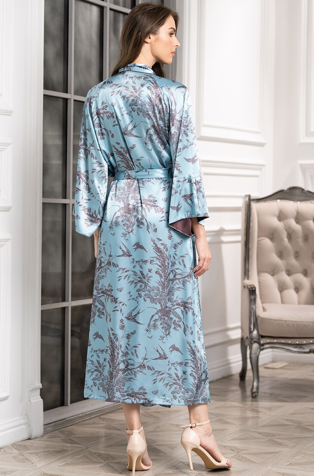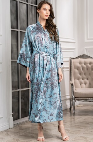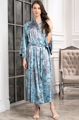 Длинный запашной халат Mia-Amore с широким рукавом длиной 3/4 . Халат выполнен из принтованного смесового шелка с однотонной отделкой. По бокам обработаны карманы.