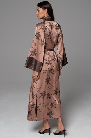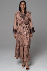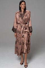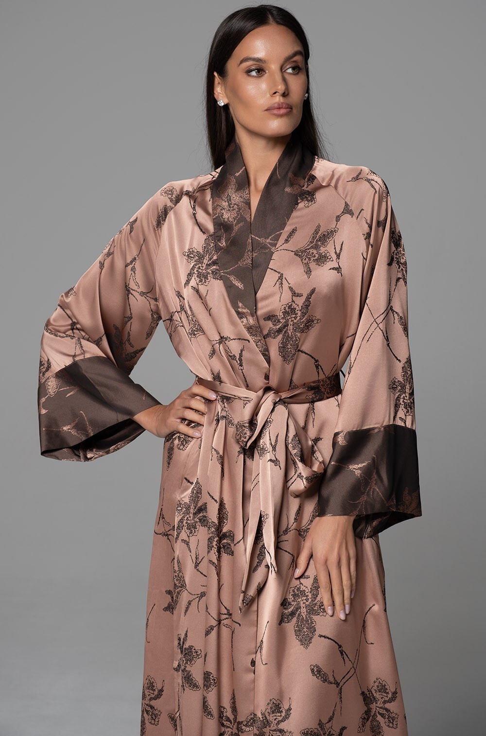 Длинный запашной халат Mia-Amore с длинными рукавами выполнен из жаккардового двухцветного смесового шёлка. Манжеты и планки халатов выполнены из отделочной тёмной стороны шёлка. Халат комплектуется широким поясом.