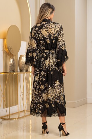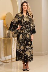 Длинный запашной халат Mia-Amore выполнен из вискозно-шёлкового полотна деворе. Низ халата и низ широких рукавов украшены ажурным чёрным кружевом. Халат запахивается широким съёмным поясом.