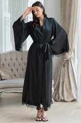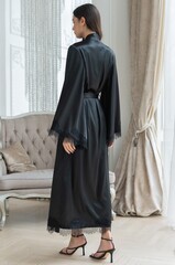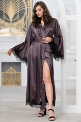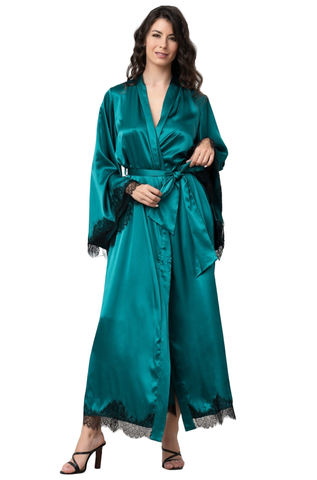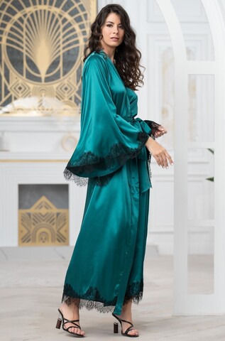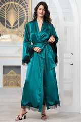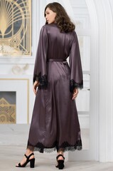 Длинный запашной халат Mia-Amore с длинными расширяющимися к низу рукавами выполнен из смесового шёлка. Рукава и низ халата декорированы контрастным широким кружевом. Халат запахивается на талии с помощью широкого пояса.