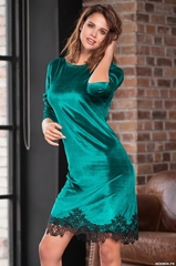 Платье Mia-Amore прилегающего силуэта длиной до колена с длинными рукавами выполнено из плотного мягкого эластичного бархата актуального изумрудного цвета. Низ платья украшен ажурным эффектным кружевом черного цвета. Состав: 95 % полиэстер, 5 % эластан.